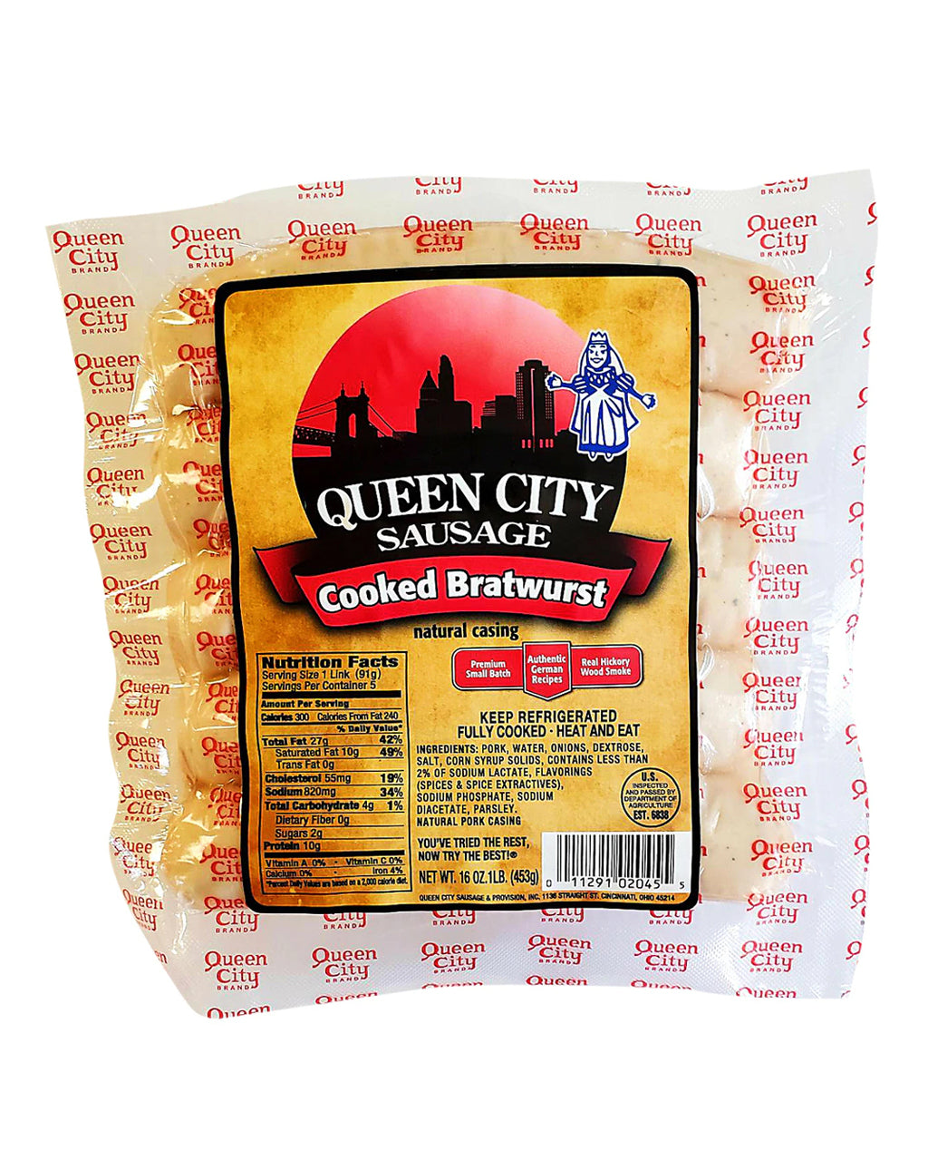***Any ADD-ON item may only be purchased with an existing PERISHABLE package that has already been selected***   *** If ADD-ON items are purchased exclusively, package may be subject to cancellation. ***   REQUIRES A REGULAR PRICED PERISHABLE PURCHASE Available in skinless and cased types, all Queen City Sausage Bratwurst are very mild sausage steam-cooked and expertly adorned with tasty spices, kicky onions, and super fresh parsley.      Includes: One pack Queen City Sausage Links (5-6 links per order)