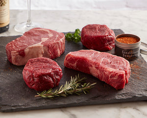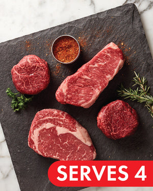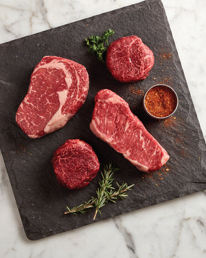 Our All-In-One Steak Package features the best of all worlds: 3 different premium cuts of our most popular steaks. Included in this unique package are two of our Signature Filet Mignon in all of their tender, buttery glory, one perfectly balanced U.S.D.A. Prime NY Strip, and one 16oz U.S.D.A. Prime Ribeye (which is basically the steak that will have you dreaming about…steak… until you enjoy your next one). This package is perfect for entertaining, for a family of fine beef connoisseurs, or for the perfect hero dinner during the week.