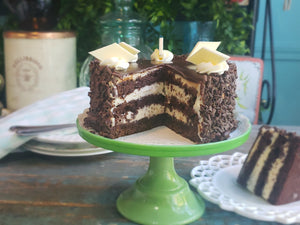 BonBonerie's signature cake for over thirty years! This double chocolate chip cake is filled and iced with rich vanilla Opera Cream filling, then enrobed with a rich chocolate glaze and decorated with Belgian chocolate shavings. Elegantly garnish the torte with white chocolate buttercream rosettes and white chocolate diamonds.