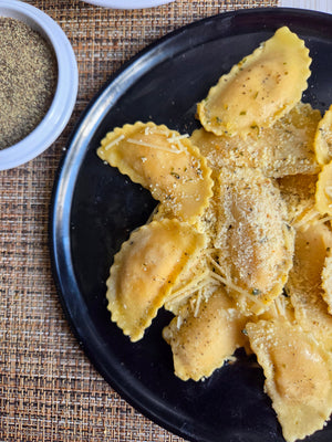We’ve transformed the iconic Roman dish into a rich, pillowy ravioli—blending Pecorino Romano, ricotta, and Parmesan with a bold finish of freshly cracked black pepper. Try it topped with a drizzle of olive oil or a pat of butter and more Pecorino for an irresistibly creamy bite. Serve with browned butter or truffle oil and a dusting of Pecorino for a next-level experience.